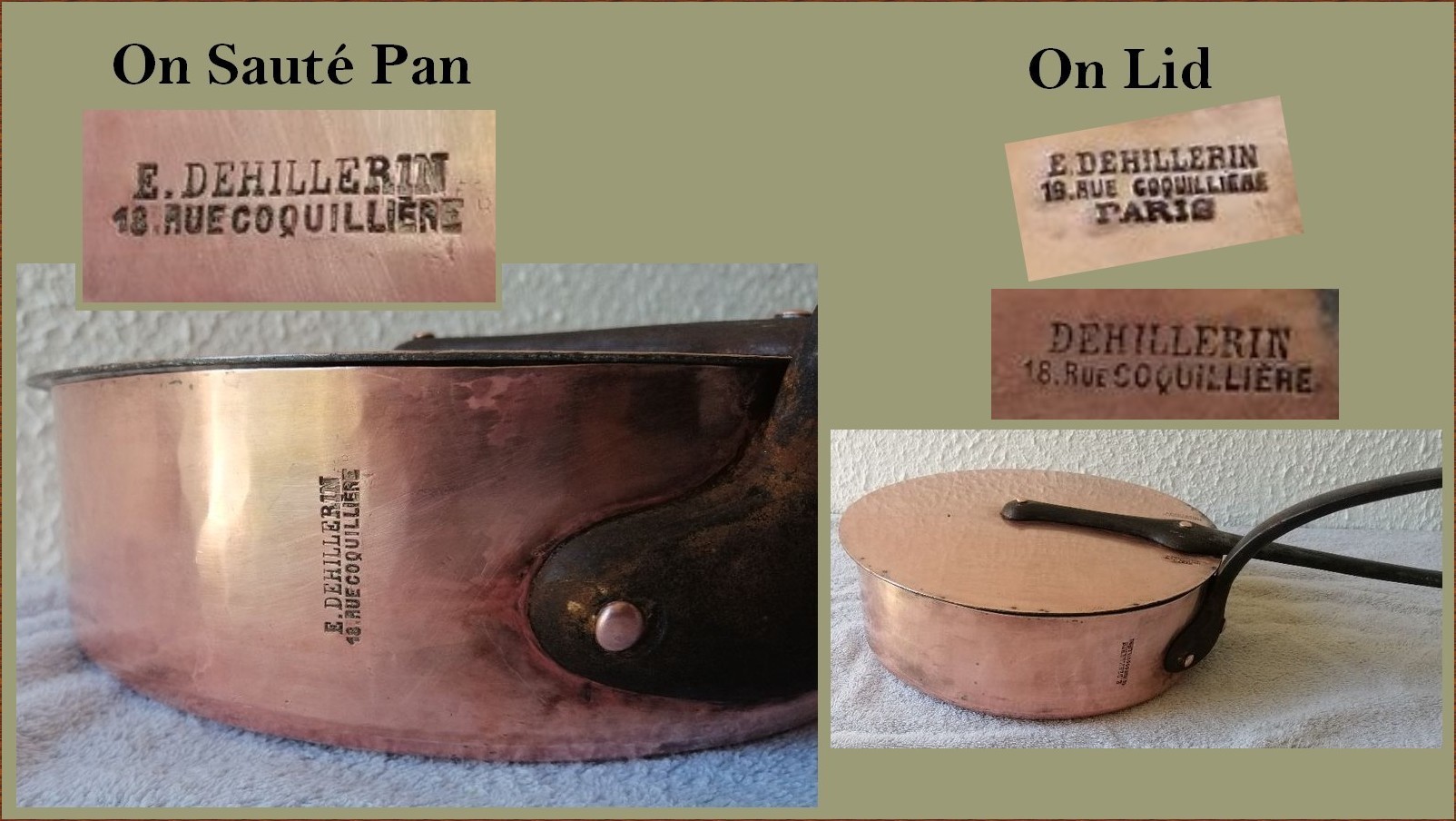 Here we have a DEHILLERIN sauté pan which carries one type of stamping and a cover which carries two others.
