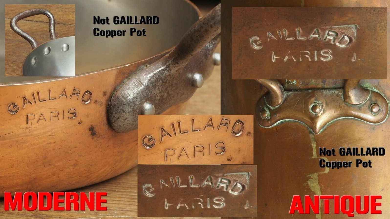 All copper pots on this page are fake GAILLARD PARIS stamps. All the pots come from different internet shops all belonging to the same person. Some of these pots that have been sold have already been offered for resale by their buyers. Buyers/Resellers who obviously don't know these are fakes. I hope these photos will help you not to acquire fake GAILLARD PARIS stamps.