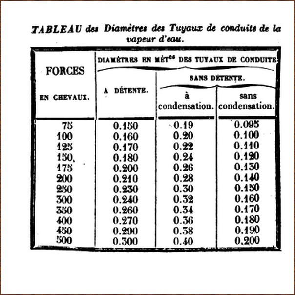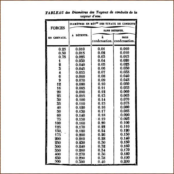 Et dans ce livre on trouve un tableau tout à fait intéressant puisqu'il indique les diamètres de tuyaux qu'il faut utiliser pour les systèmes à vapeur (en fonction du type de chaudières et de la puissance).